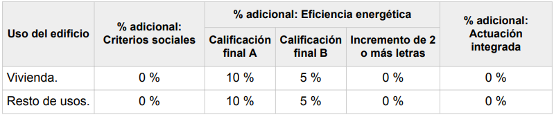 2º Ayuda adicional por criterio social, eficiencia energética o actuación integrada. Se podrá obtener una ayuda adicional a la ayuda base. El cálculo de la ayuda adicional se realizará sumando el porcentaje de cada uno de los tres criterios según corresponda. En el caso del criterio de eficiencia energética solo se podrá aplicar uno de los tres porcentajes, bien calificación energética A, B o incremento de 2 o más letras. Los valores de la ayuda adicional que corresponden a esta tipología de actuación, se indican en el cuadro siguiente: